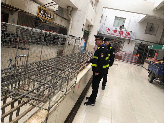 各镇街、开发区城管中队执法人员在全区范围内采取“马路办公”机制,对沿街商铺、餐饮门店、火车站、汽车站等重点路段发放宣传资料,悬挂条幅,充分利用执法车辆机动巡回播放防疫公告。针对洪山路菜市街、相山路菜市街、惠黎菜市街等33处活禽交易场所进行重点排查并取缔。