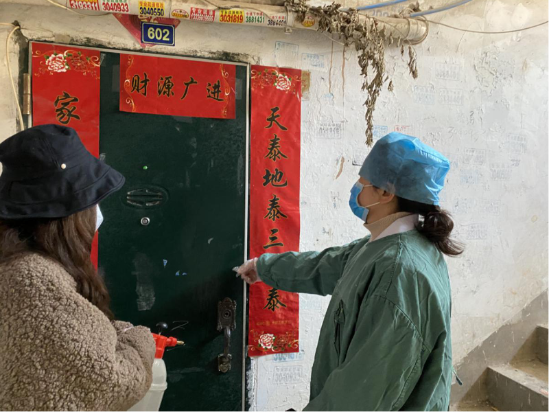 区发改委防疫包保人员汪瑞琪针对社区楼道单元特别是武汉返乡人员住处,开展消毒工作。