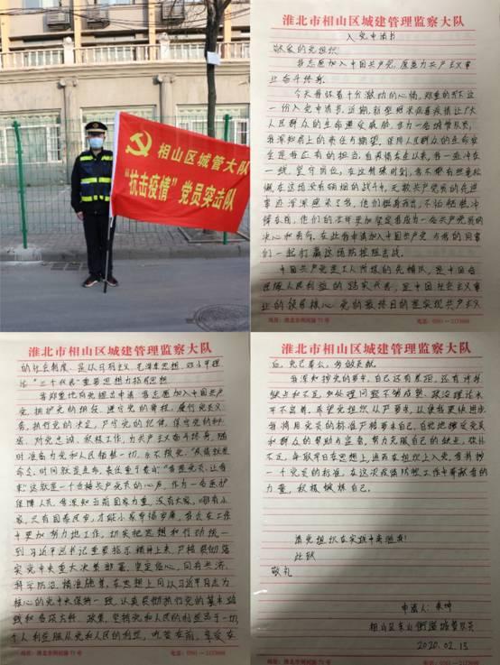 “我志愿加入中国共产党,为共产主义事业奋斗终身。我会努力在防控疫情的斗争中经受考验,接受党组织的指挥和统一调度,打赢这场疫情防控阻击战。”写下火线入党申请书的是相山区城管大队东山街道城管中队朱坤,他是这么写的,更是这么做的。