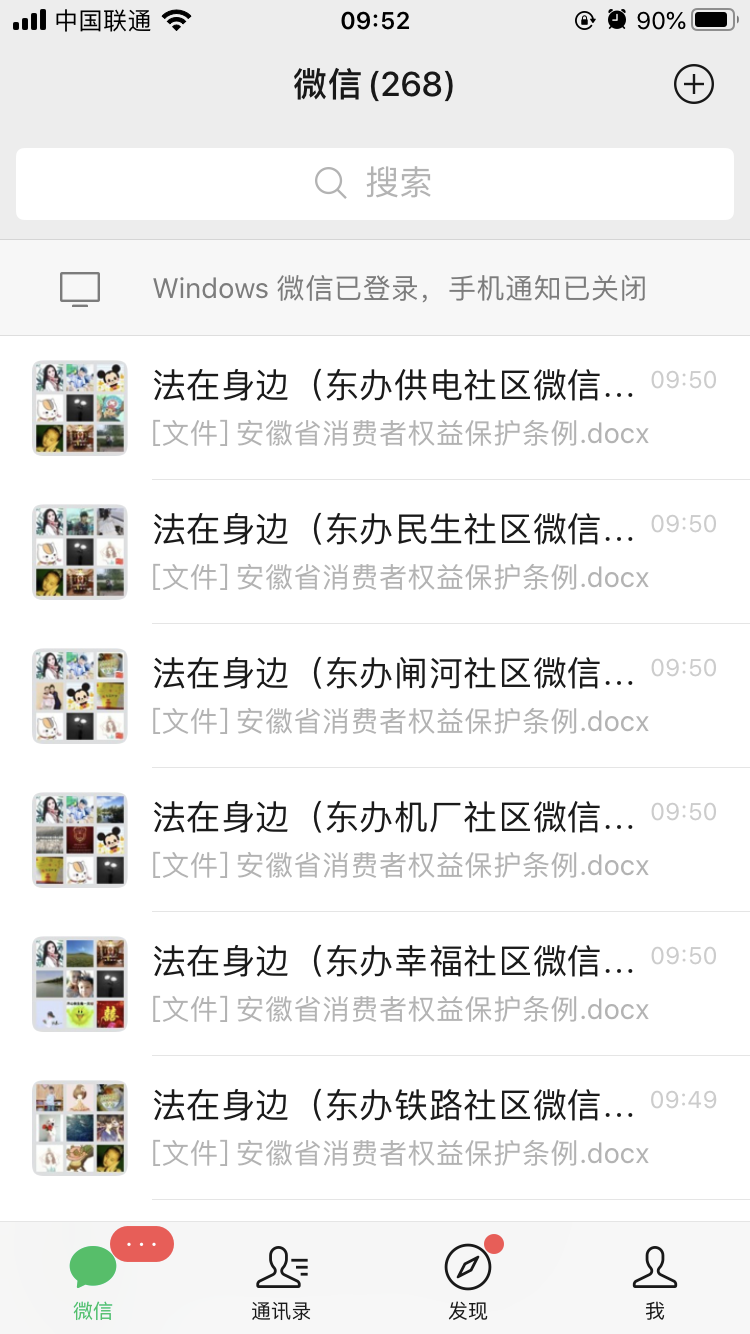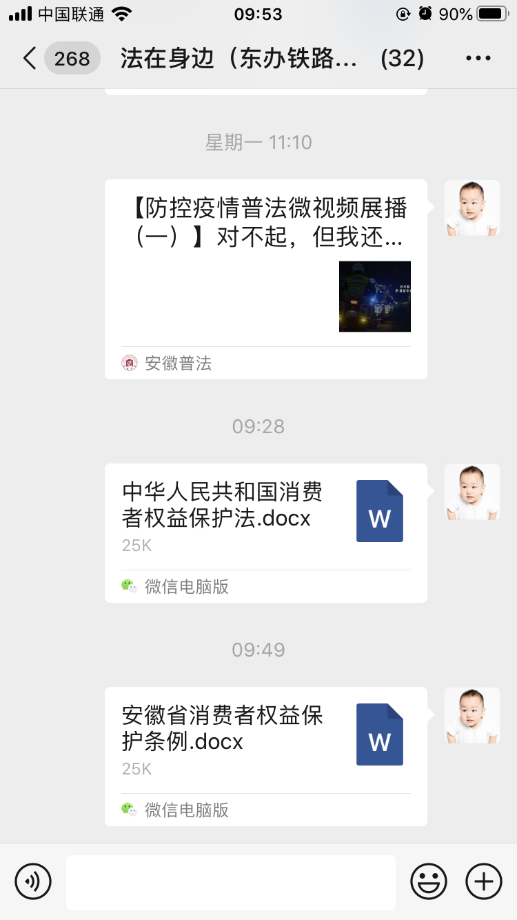 东办司法所通过各社区“法在身边”微信群向辖区居民宣传法律知识,通过微信群宣传了《消费者权益保护法》、《食品安全法》、《安徽省消费者权益保护条例》让广大居民更好的了解法律知识,同时司法所还通过微信群转发市局普法抖音号、普法公众号发布的法律知识、小视频等内容,增强法治宣传趣味性,提高辖区居民学法的积极性。