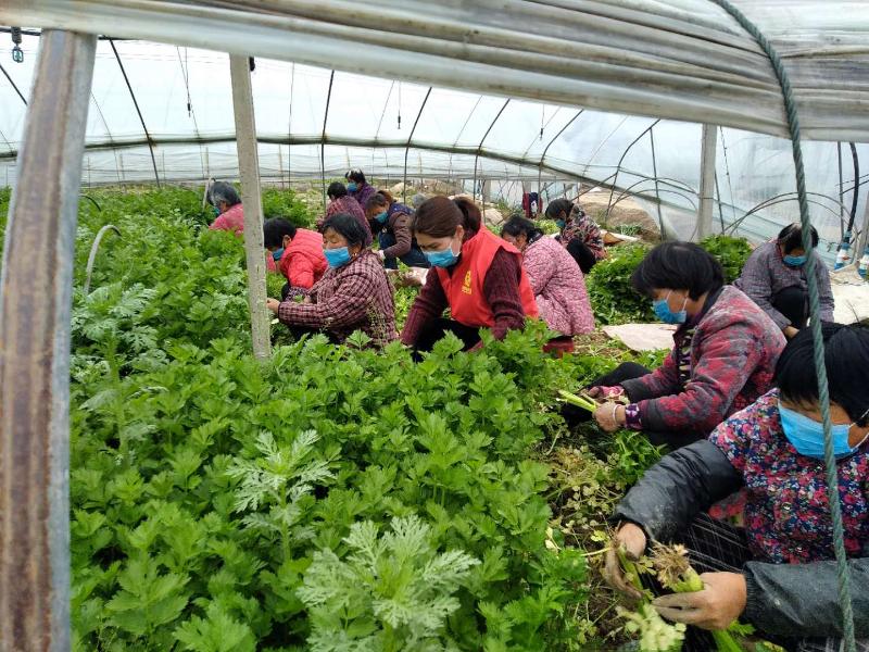 下图为3月31日,钟楼村妇联主席带领十几名贫困妇女在“美丽家园行动”项目点该村种植大户张巧的蔬菜大棚中有条不紊的收割法国皇后西芹。