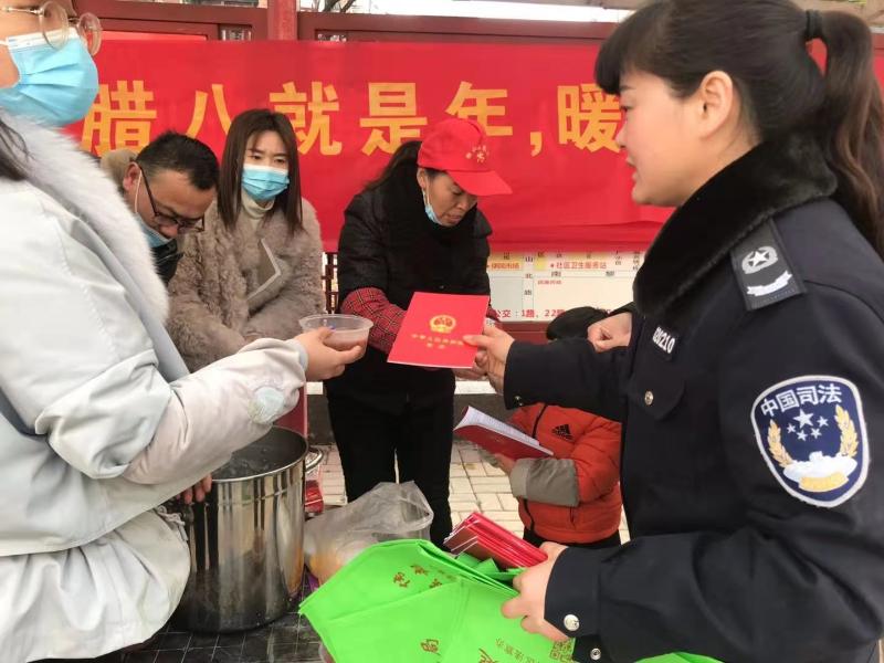 1月20日上午,三堤口司法所普法志愿者送法进社区,和社区工作人员一起为居民送上一道热气腾腾的“腊八法律营养餐”。