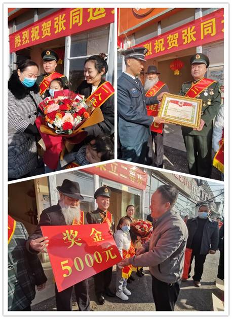 在欢庆的锣鼓声中,郭剑影一行将喜报、鲜花和慰问金送到了张同运及其家属手中。