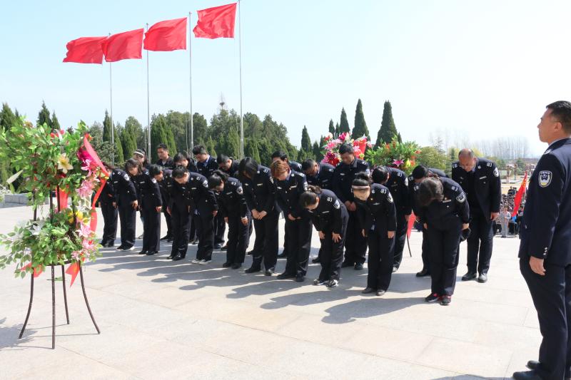 在双堆集烈士陵园,全体干警排着整齐的队伍,在纪念碑前敬献花圈、深深鞠躬为革命烈士们哀悼!在纪念馆通过现场参观、原景重现和解说员的介绍,学习革命先辈坚定的理想信念,对党的事业无比忠诚的革命精神;学习革命先辈不怕困难顽强拼搏勇于开拓的革命精神。