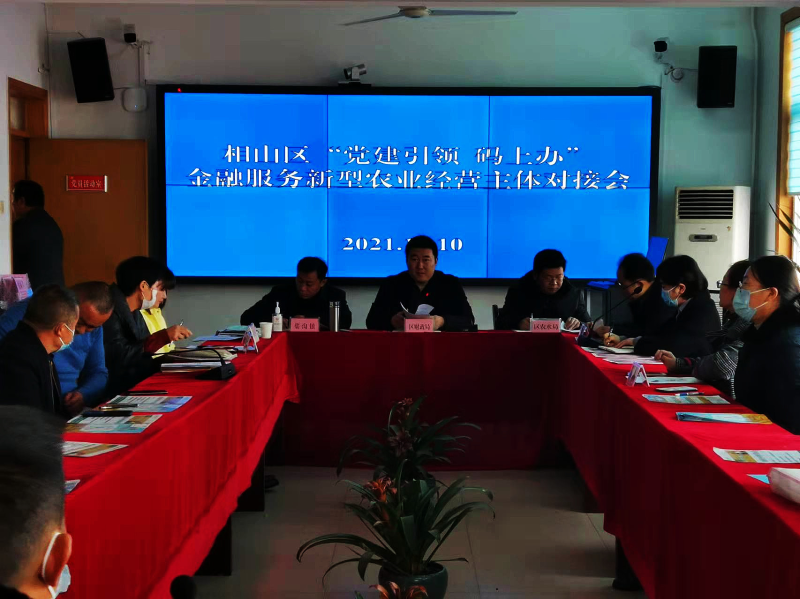 2021年12月10日上午,相山区农业农村水利局与财政局在渠沟镇政府三楼会议室召开相山区“党建引领 码上办”金融服务新型农业经营主体对接会。渠沟镇、相山经济开发区、曲阳街道分管领导及辖区内各新型农业经营主体法人代表,邮储银行淮北分行、农业银行淮北分行业务人员等参加了会议。会上,区财政局介绍了相山区《“党建引领 码上办”行动金融服务方案》;邮储银行淮北分行、农业银行淮北分行参会人员对一些信贷产品的惠农政策进行了宣传,介绍“劝耕贷”等金融贷款办理流程;各新型农业经营主体与金融机构现场办理业务。