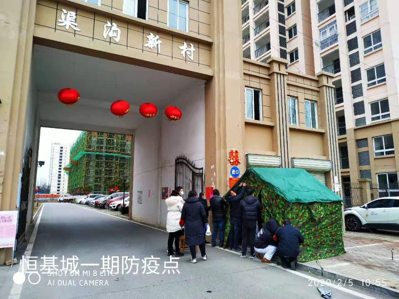2020年2月5日上午在恒基城渠沟新村、濉河三期西区两个小区卡点分别搭设帐篷,社区工作人员及物业公司派人24小时值班,严控小区居民进出。关键时刻,总有人挺身而出,也总有力量温暖着我们!疫情来袭,我们同舟共济,共克时艰。支持疫情防控,需要我们每个人的努力。