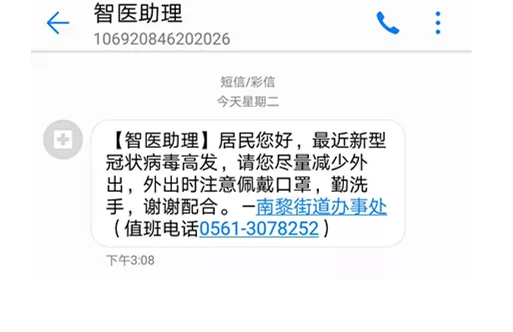 此外,智能系统还可发送“居民你好,最近新型冠状病毒高发,请您尽量减少外出,外出时记得佩戴口罩,勤洗手,谢谢配合”等关于疫情防控方面的短信,进一步强化居民的预防意识。