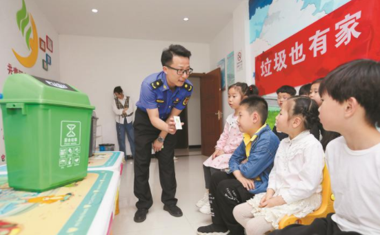 5月27日,南黎街道卫计办和相山区市场管理局的志愿者带领孩子们进行垃圾分类体验游戏。