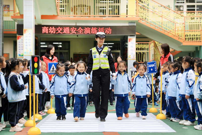 为充分调动幼儿园小朋友学习道路交通安全知识的兴趣,民警根据幼儿园孩子们的年龄特点,设计了斑马线游戏,并用浅显易懂的语言给孩子们讲解怎样安全过马路及各种交通信号标志的含义,教育孩子要懂得交通安全常识、自觉遵守交通法规,培养引导他们养成良好的文明交通习惯。
