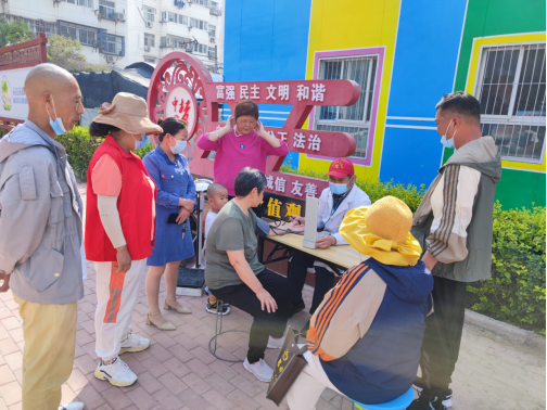 另一边,卫生服务站的志愿者也在有序地为居民测量血压,解答居民的问题,叮嘱居民天气炎热要注意饮食和休息。