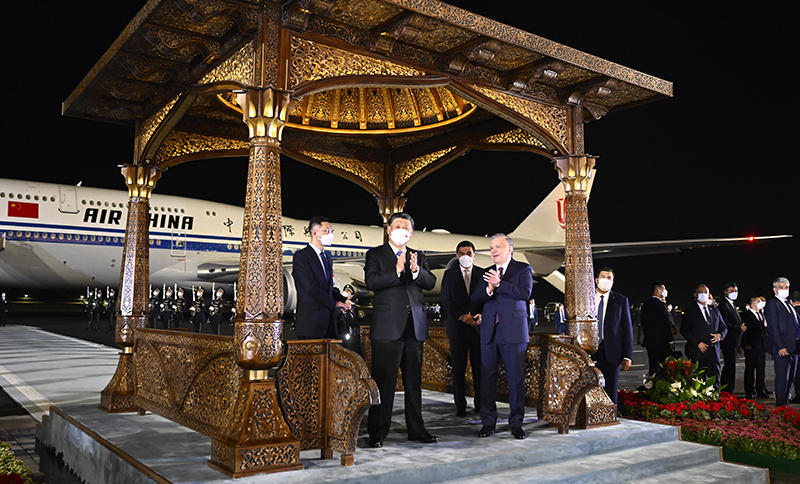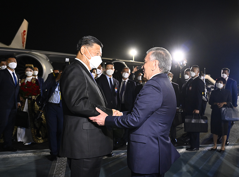 当地时间9月14日晚,国家主席习近平乘专机抵达撒马尔罕,开始对乌兹别克斯坦共和国进行国事访问并出席上海合作组织成员国元首理事会第二十二次会议。这是乌兹别克斯坦总统米尔济约耶夫、政府总理阿里波夫、外长诺罗夫、撒马尔罕州州长图尔济莫夫等高级官员在机场热情迎接。新华社记者 李学仁 摄