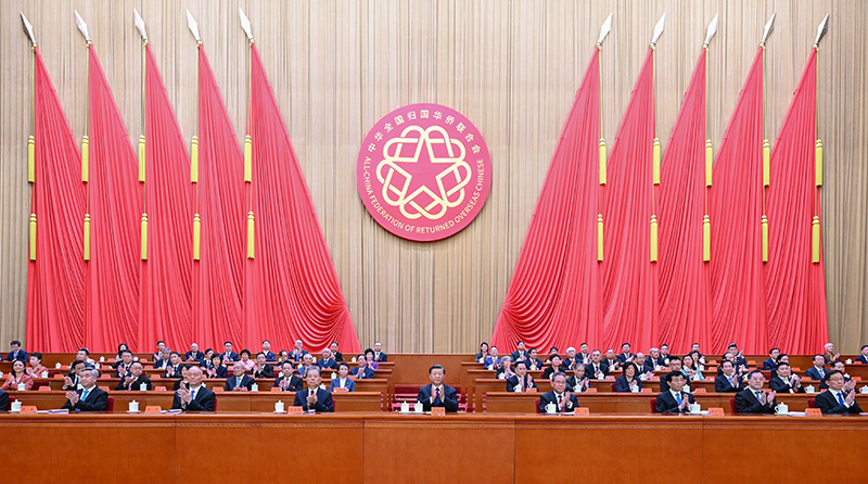 人民大会堂大礼堂气氛庄重而热烈。主席台上方悬挂着“第十一次全国归侨侨眷代表大会”的会标,后幕正中是象征着五大洲侨胞心向祖国的中国侨联会徽,10面红旗分列两侧。二楼眺台悬挂着“以习近平新时代中国特色社会主义思想为指导,全面贯彻党的二十大精神,团结凝聚广大归侨侨眷和海外侨胞为全面建设社会主义现代化国家、全面推进中华民族伟大复兴而奋斗!”巨型横幅。来自全国各地的近1200名归侨侨眷代表和来自100多个国家的近600名海外侨胞特邀嘉宾欢聚一堂。