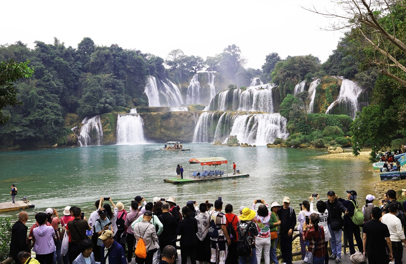 2024年12月5日,游客在中越德天(板约)瀑布跨境旅游合作区中国一侧游览。新华社记者 金皓原 摄