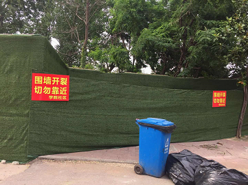1、树木倾倒围墙开裂,办事处与社区组织人员5月26日将倾斜树木清除,2、因创建暂时无法拆除,5月29日,社区在南侧靠近道路预留安全距离搭建围挡,围挡标注警示标志,禁止人员靠近,待后期拆除。
