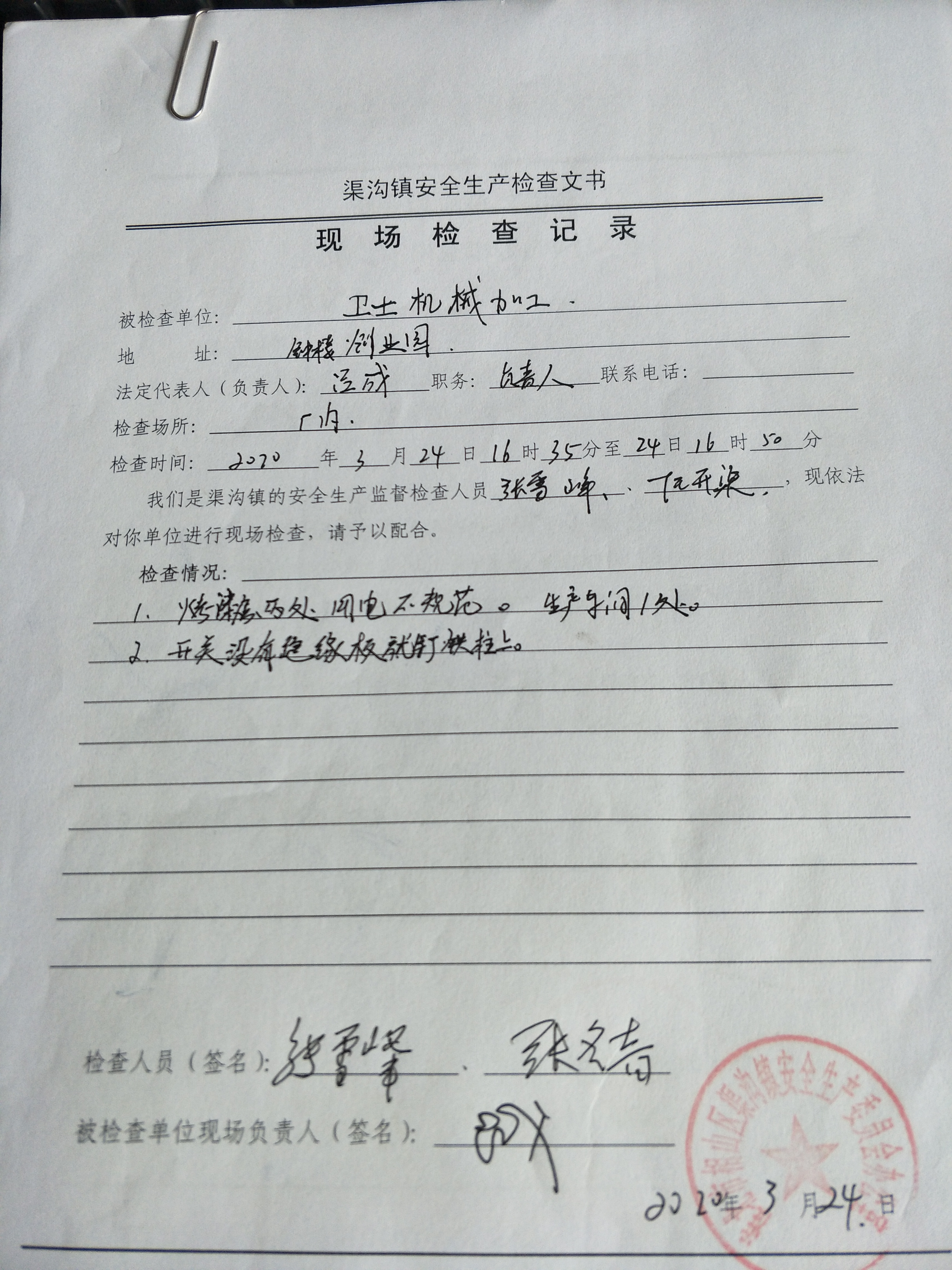 【卫士机械加工】安全生产检查问题