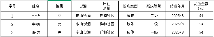东山街道2025年8月重度残疾人护理新增补贴发放情况