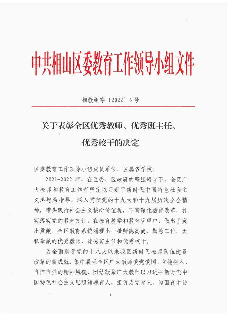 相山区2022年表彰全区优秀教师、优秀班主任、优秀校干的决定