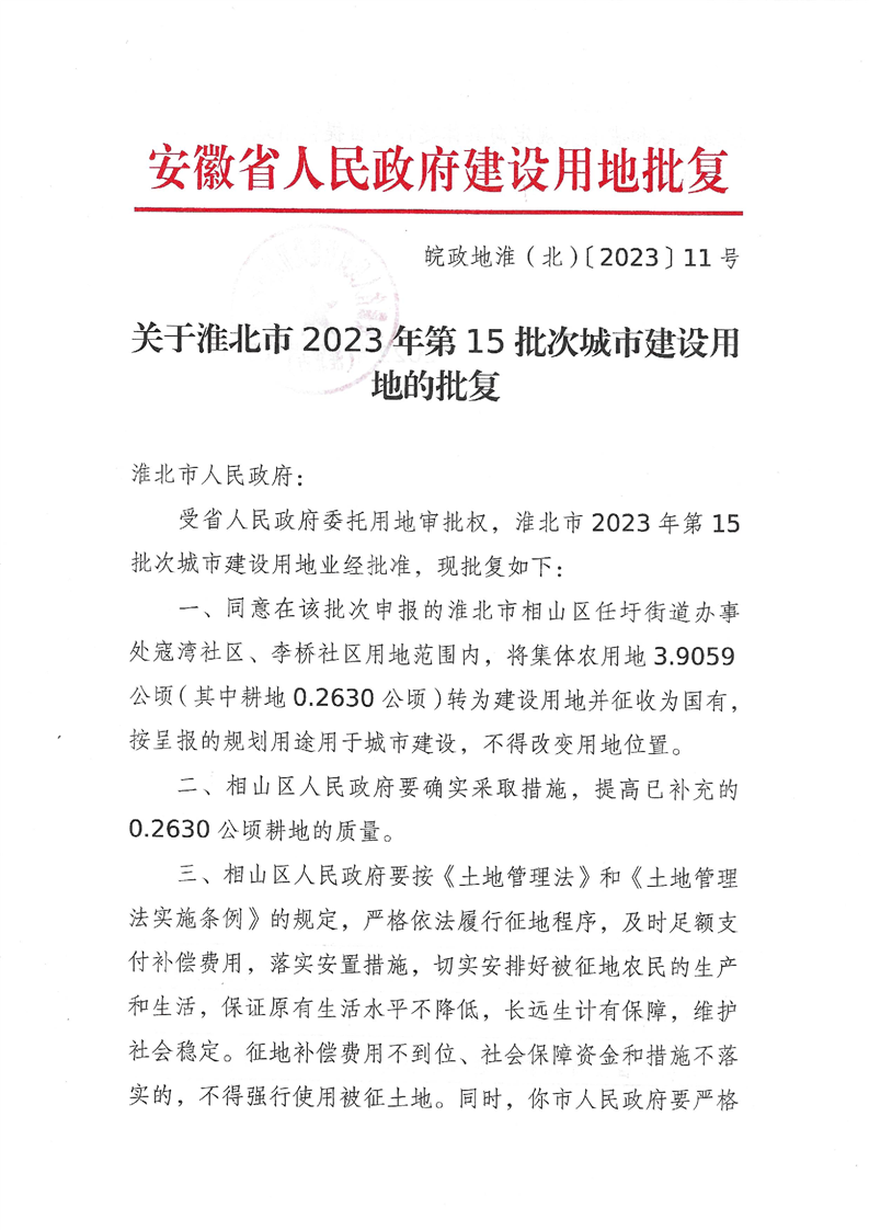 淮北市2023年第15批次城市建设用地批复