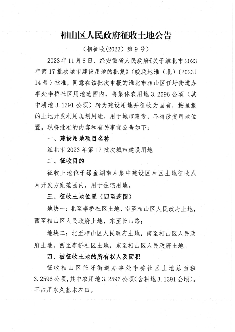 淮北市2023年第17批次城市建设用地征收土地公告