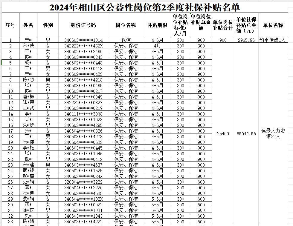 相山区公益性岗位2024年第二季度补贴