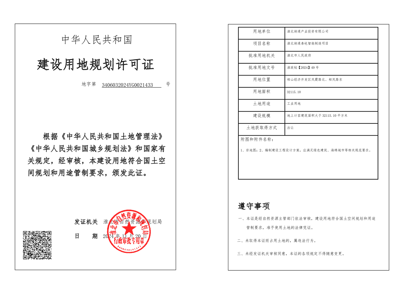 淮北纳通泰屹智能制造项目建设用地规划许可证批后公告