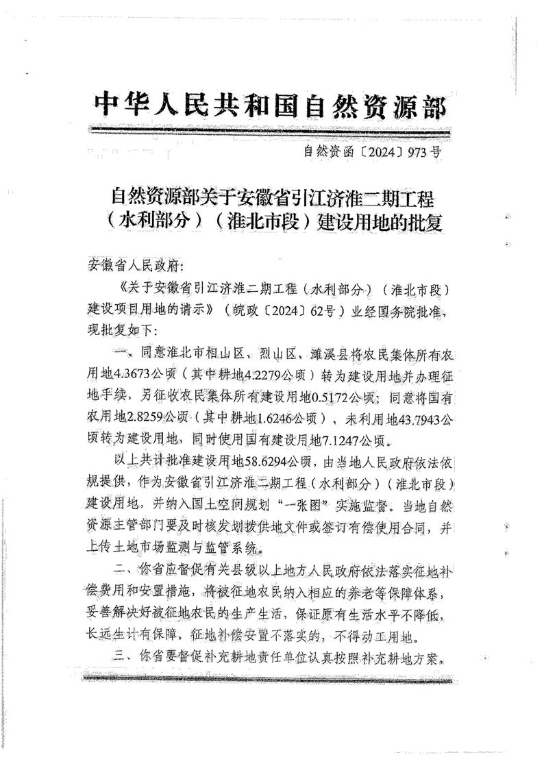 自然资源部关于安徽省引江济淮二期工程(水利部分)(淮北市段)建设用地的批复