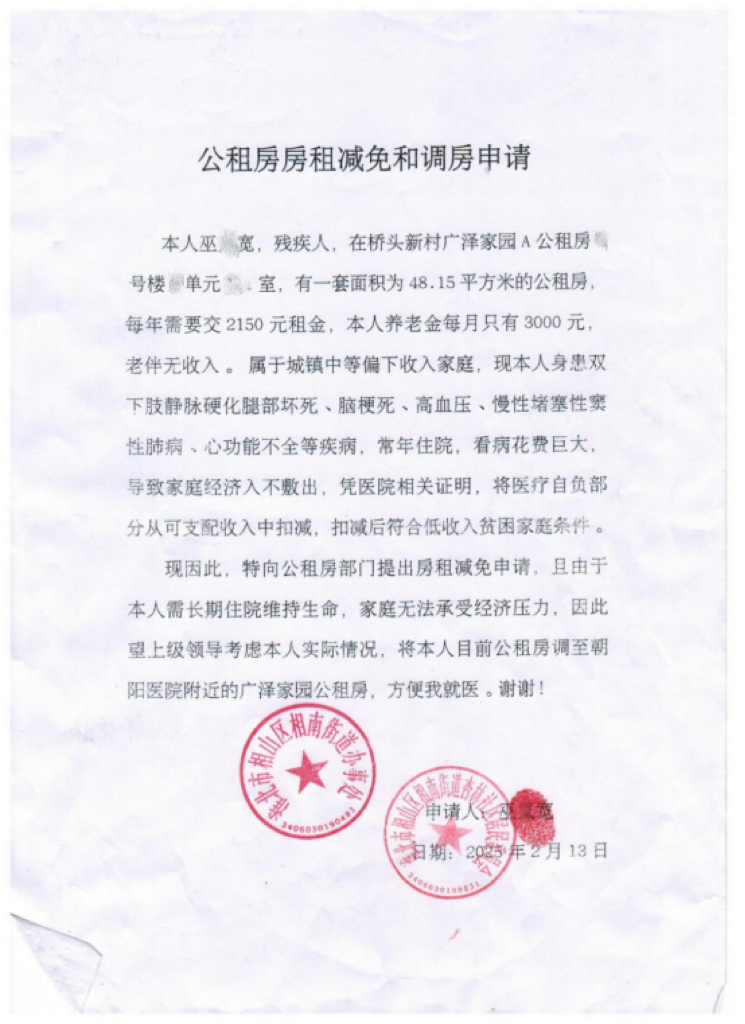 根据《淮北市人民政府办公室关于印发淮北市公共租赁住房管理办法(实行)的通知》(淮政办〔2023〕26号)文件规定, 第十九条第二款“承租人家庭发生灾难性事故或者家庭主要人员突发重大疾病继续救治造成生活困难的”文件精神和其提供的有关证明材料,现就实际情况进行公示,公示时间:2025年3月11日-3月17日。对公示情况有异议的,向淮北市公租房运营管理服务中心举报投诉。