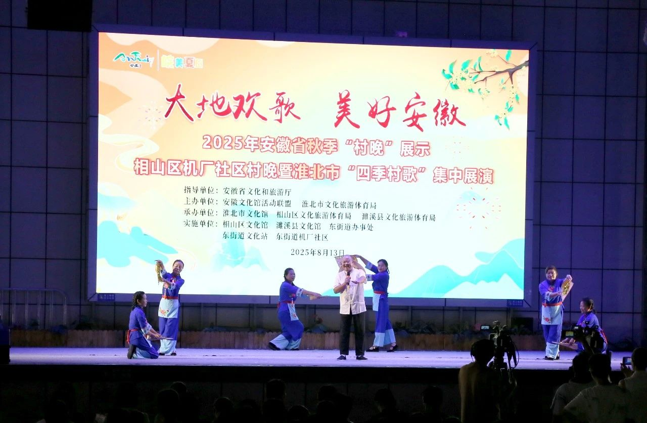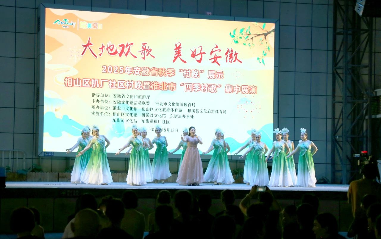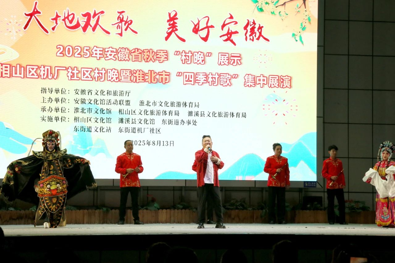 为深入贯彻落实乡村振兴战略,丰富农村精神文化生活,8月13日,由安徽省文化和旅游厅悉心指导,安徽文化馆活动联盟、淮北市文化旅游体育局联合主办。淮北市文化馆、相山区文化旅游体育局、濉溪县文化旅游体育局携手承办的“大地欢歌 美好安徽”2025年安徽省秋季“村晚”展示相山区机厂社区村晚暨淮北市“四季村歌”集中展演在淮北南翔云集举办。活动以村歌为载体,来自三区一县的十七个节目,以艺术的形式展现新时代农民的精神风貌。