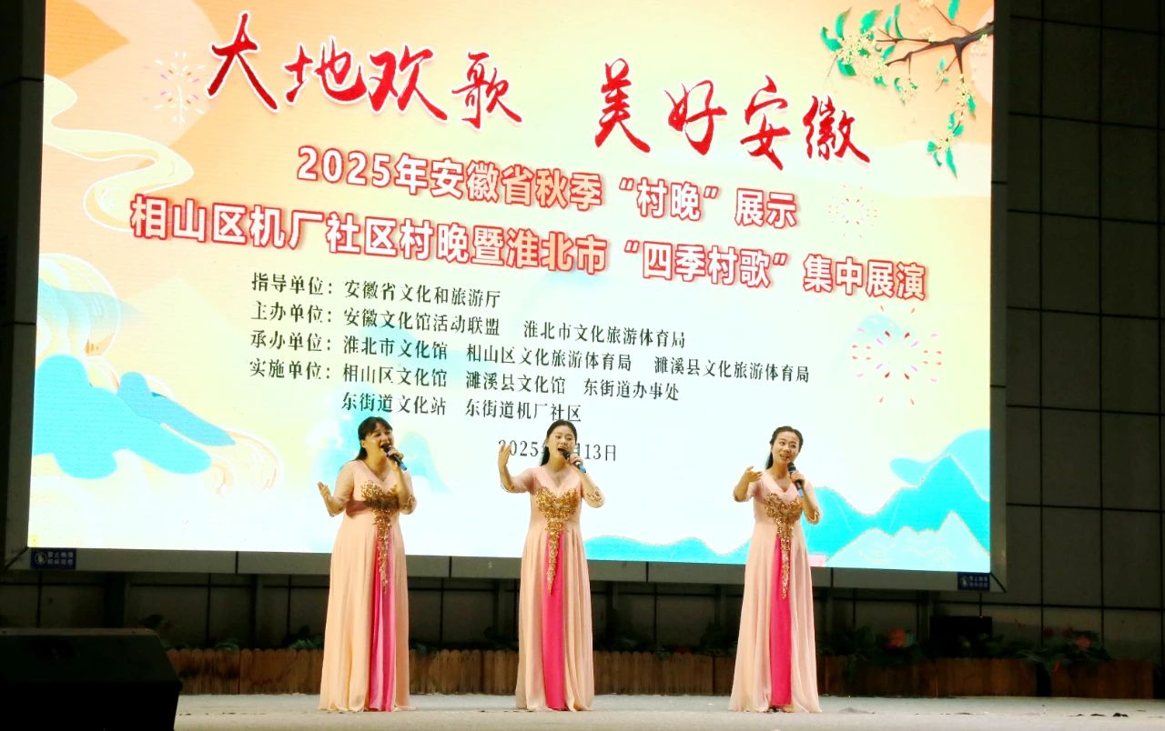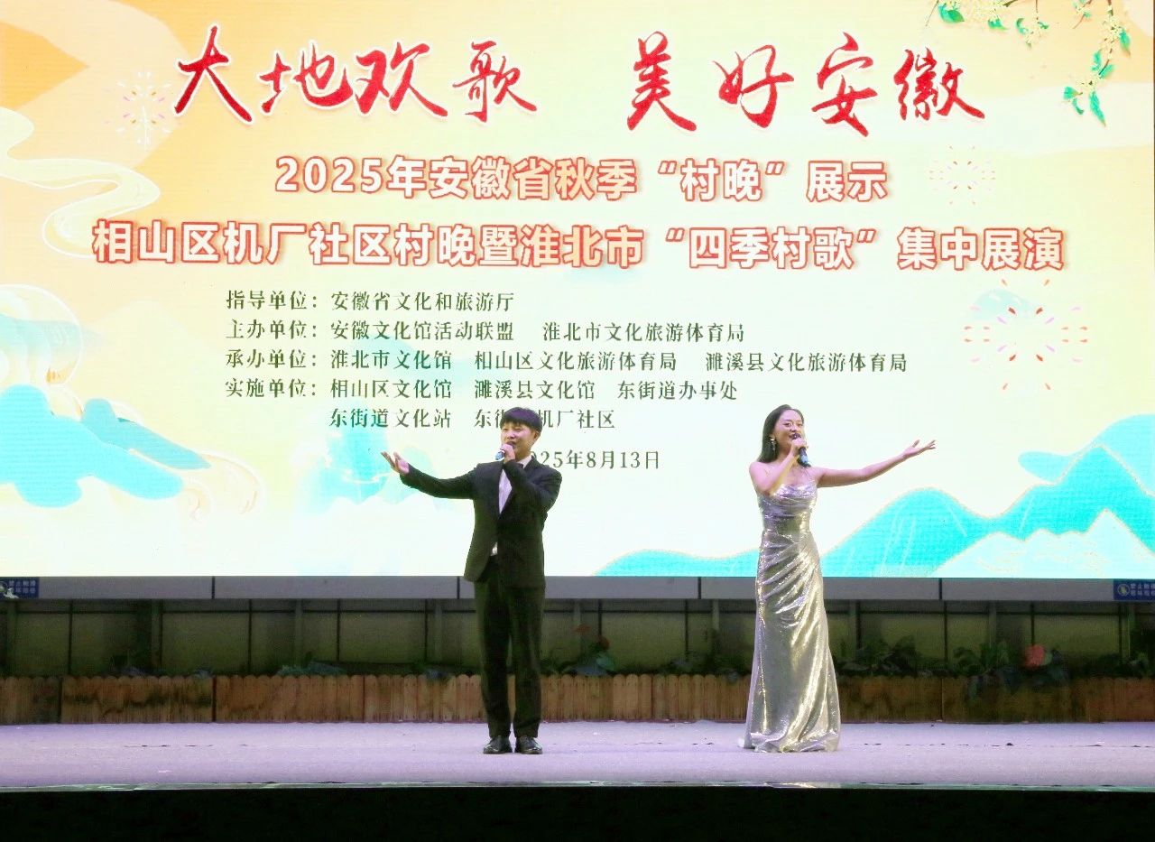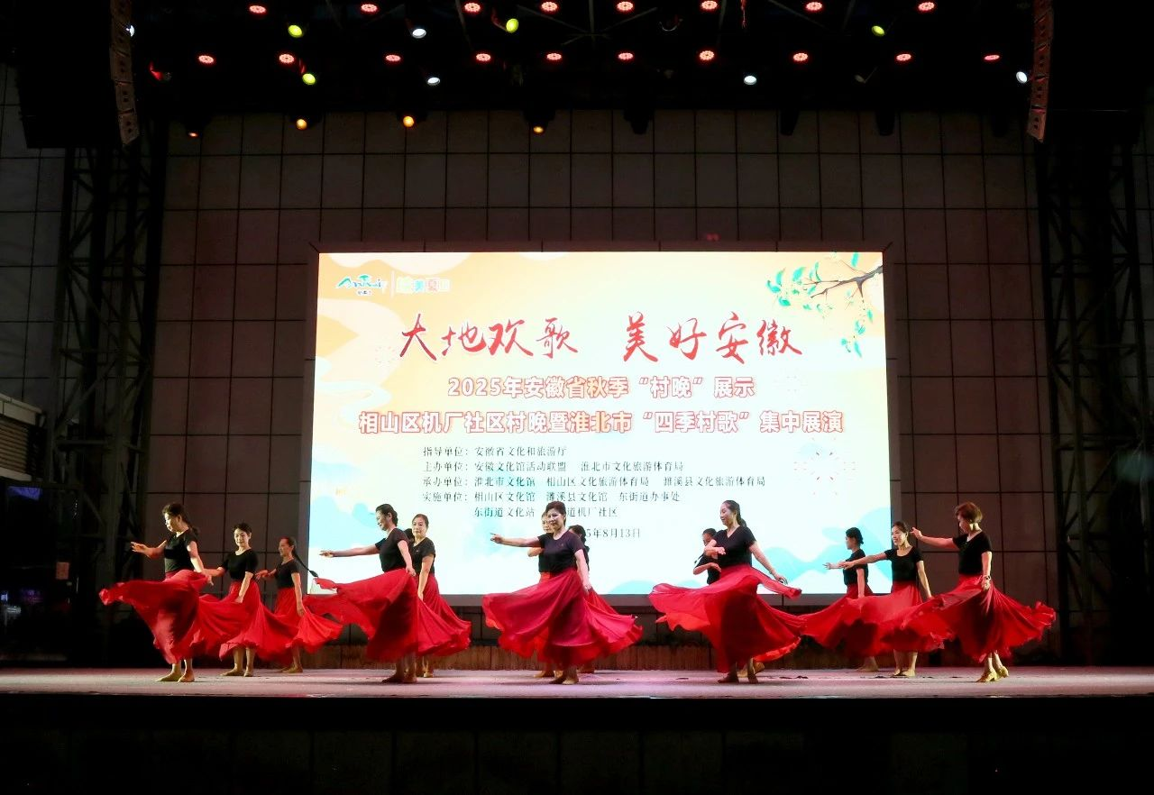 为深入贯彻落实乡村振兴战略,丰富农村精神文化生活,8月13日,由安徽省文化和旅游厅悉心指导,安徽文化馆活动联盟、淮北市文化旅游体育局联合主办。淮北市文化馆、相山区文化旅游体育局、濉溪县文化旅游体育局携手承办的“大地欢歌 美好安徽”2025年安徽省秋季“村晚”展示相山区机厂社区村晚暨淮北市“四季村歌”集中展演在淮北南翔云集举办。活动以村歌为载体,来自三区一县的十七个节目,以艺术的形式展现新时代农民的精神风貌。