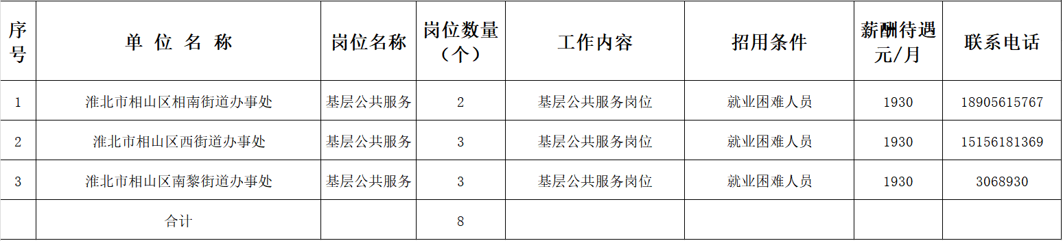 为促进就业困难人员稳定就业,提高就业质量,根据《安徽省公益性岗位开发管理办法》(皖人社秘〔2024〕286号)和《安徽省就业补助资金管理暂行办法》(财社〔2016〕1754号)关于公益性岗位开发管理工作要求,经用人单位申请,我局审核,拟确定淮北市相山区西街道办事处等3家单位为相山区2025年度公益性岗位用人单位,合计开发公益性岗位8个。按照公益性岗位开发程序,本着“公开、公平、公正”原则,现就2025年公益性岗位开发情况予以公示。如有异议请向相山区人力资源和社会保障局反映。监督电话:0561-3193265。