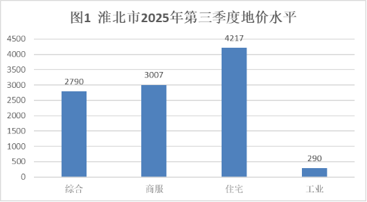 2025年第三季度淮北市综合地价水平值为2790元/平方米,其中商服用途地面地价水平值为3007元/平方米;住宅用途地面地价水平值为4217元/平方米;工业用途地面地价水平值为290元/平方米。三类用地中,住宅地价最高,商服地价次之,工业地价最低(见表1及图1)。