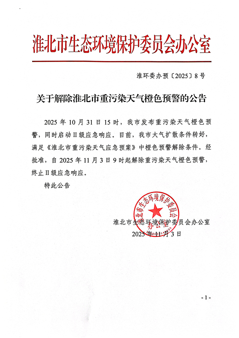 淮环委办预【2025】8号关于解除淮北市重污染天气橙色预警的公告