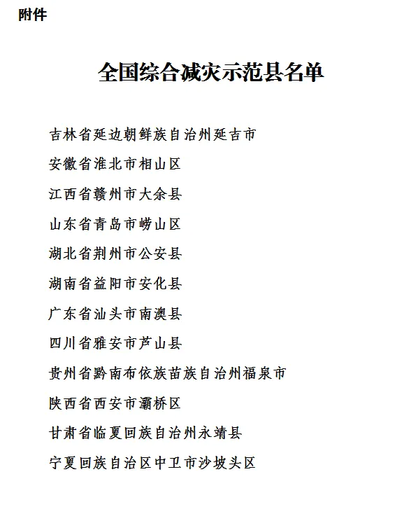2019年以来,全国综合减灾示范县创建试点单位认真贯彻落实党中央、国务院关于防灾减灾救灾的决策部署,加强组织领导,强化资源统筹和力量整合,创新推动综合减灾工作深入开展,取得积极成效。为充分发挥典型示范和引领作用,根据全国综合减灾示范县创建工作有关规定,经评估验收、复核认定,国家防灾减灾救灾委员会办公室、应急管理部决定授予吉林省延边朝鲜族自治州延吉市等12个县(市、区)全国综合减灾示范县称号(名单见附件),有效期为5年。