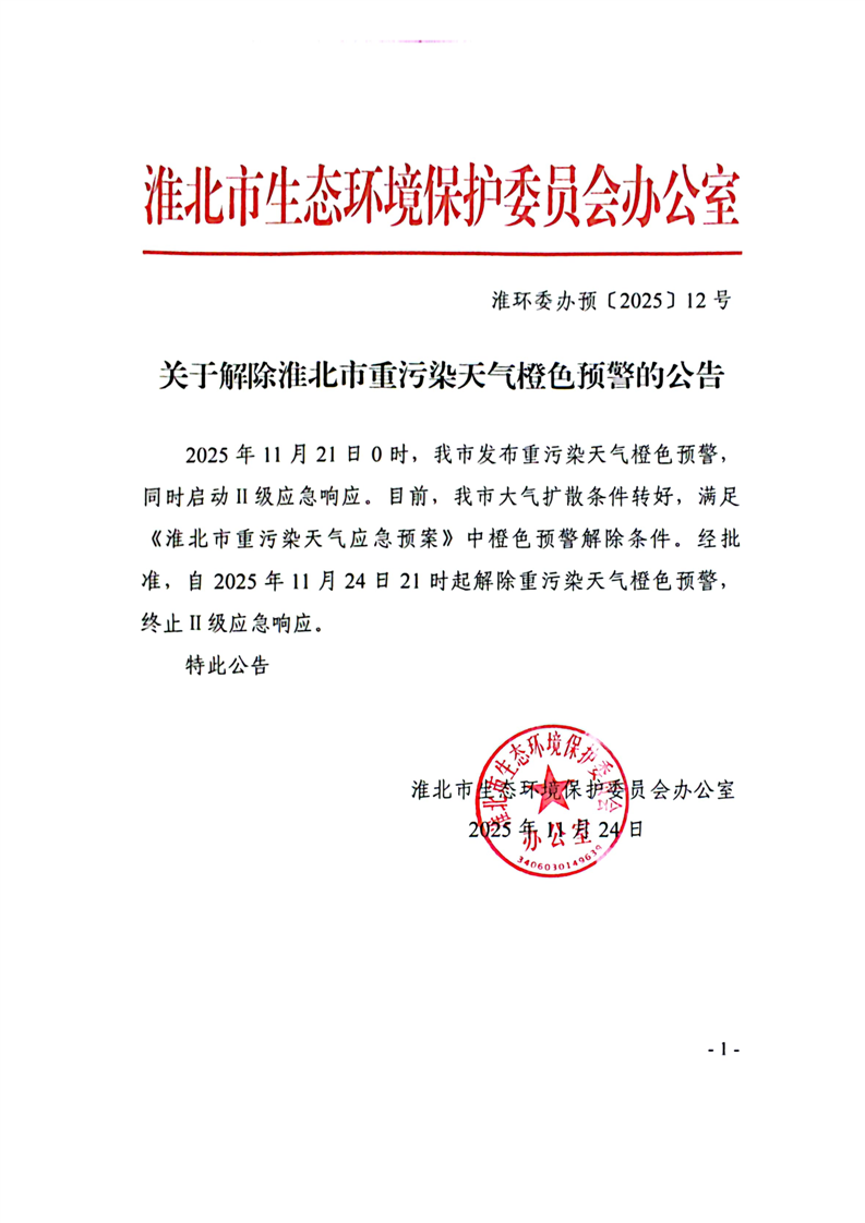 淮环委办预〔2025〕12号关于解除重污染天气橙色预警的公告