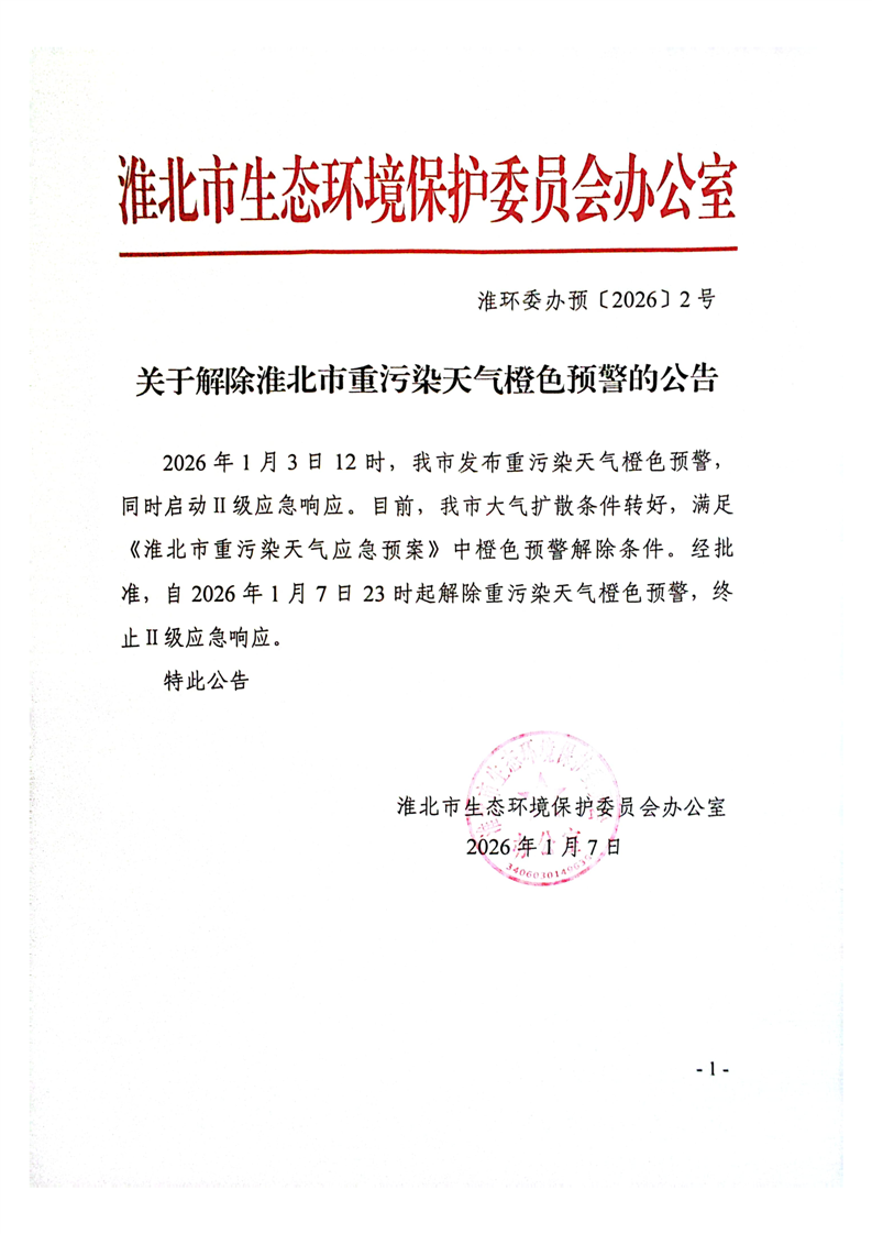 淮环委办预〔2026〕2号关于解除重污染天气橙色预警的公告