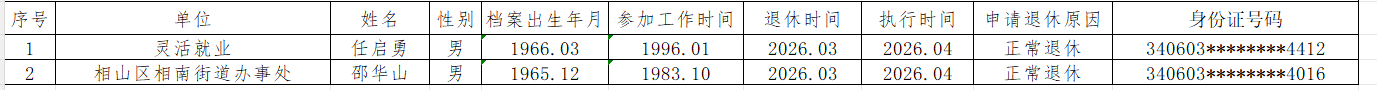根据《安徽省参加企业基本养老保险人员审批管理规定》(劳社〔2008〕45号)要求,现对2026年1月份申请退休人员基本情况予以公示,欢迎广大干部群众监督。