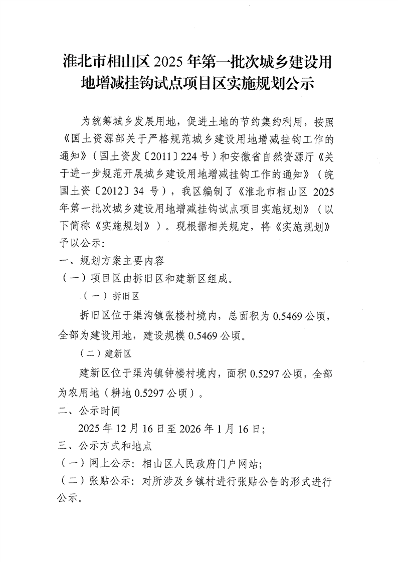 淮北市相山区2025年第一批次城乡建设用地增减挂钩试点项目区实施规划公示