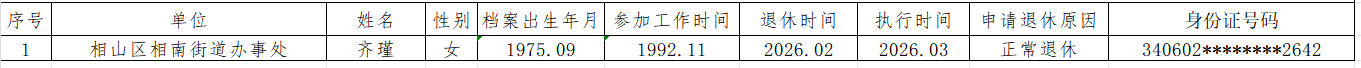 根据《安徽省参加企业基本养老保险人员审批管理规定》(劳社〔2008〕45号)要求,现对2026年2月份申请退休人员基本情况予以公示,欢迎广大干部群众监督。