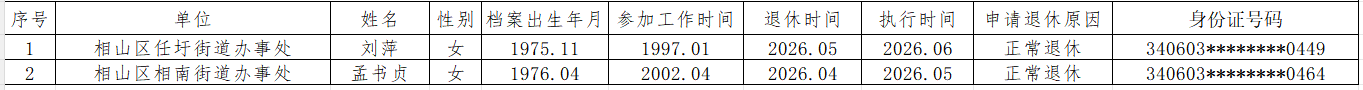 根据《安徽省参加企业基本养老保险人员审批管理规定》(劳社〔2008〕45号)要求,现对2026年3月份申请退休人员基本情况予以公示,欢迎广大干部群众监督。