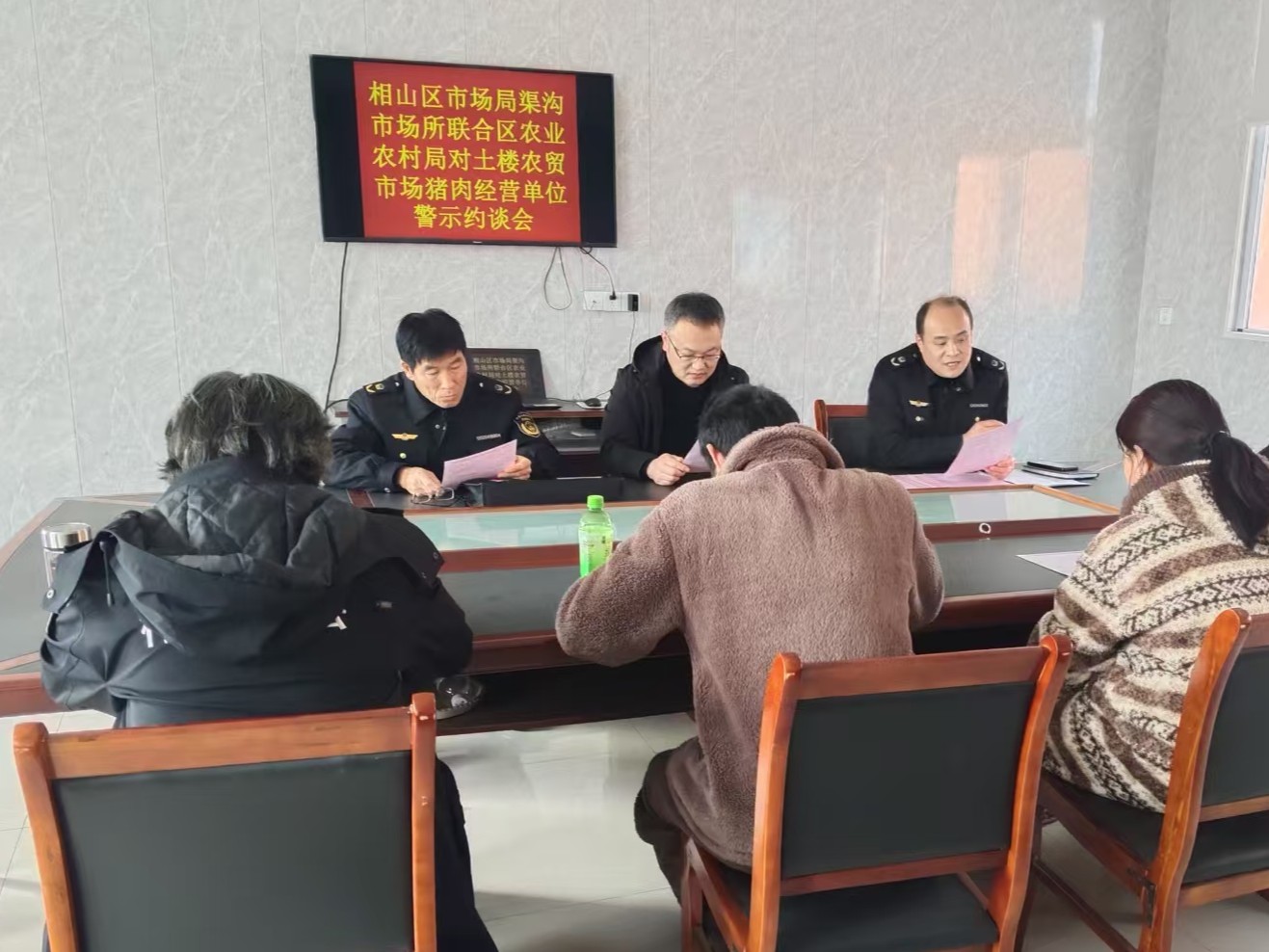 为保障辖区生猪肉产品质量安全,规范猪肉市场经营秩序,近日,渠沟市场监管所组织开展生猪肉经营商户集中约谈工作。