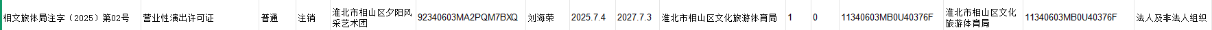 淮北市相山区夕阳风采艺术团营业性演出许可证注销