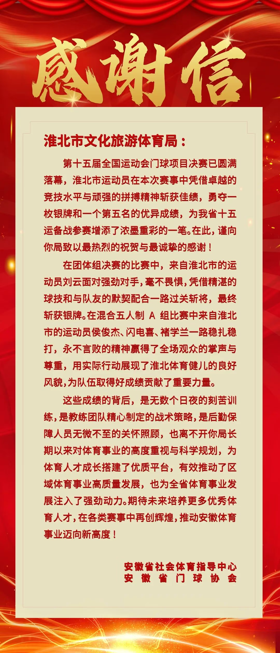感谢信!恭喜淮北市运动健儿斩获佳绩