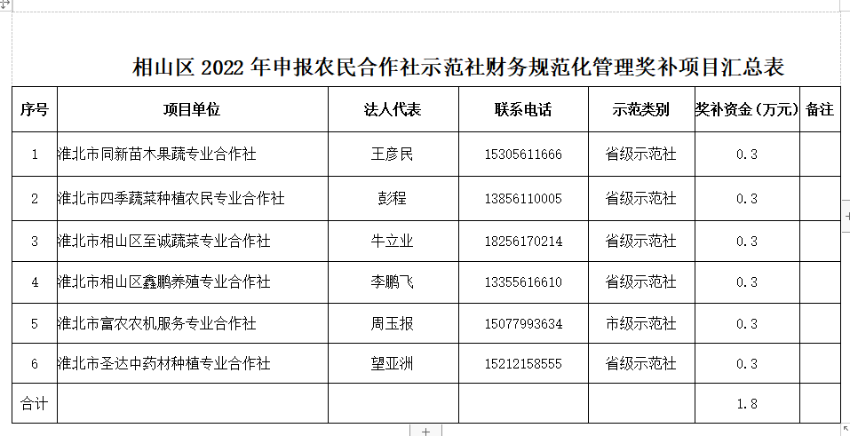 相山区2022年农民专业合作经济组织补助资金使用情况