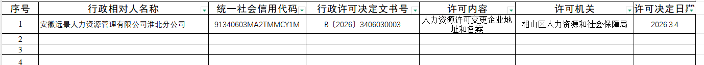 安徽远景人力资源管理有限公司淮北分公司人力资源行政许可公示