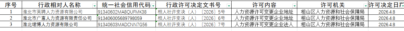 淮北市英聘人力资源有限公司、淮北市广惠人力资源有限责任公司、淮北珺博人力资源有限公司人力资源行政许可公示