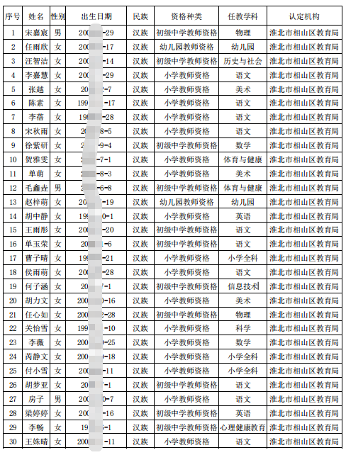 2025年下半年向相山区教育局申请认定中小学(幼儿园)教师资格,经线上审核通过,且体检合格、公安机关核查无犯罪记录情况、公示无异议的人员如下: