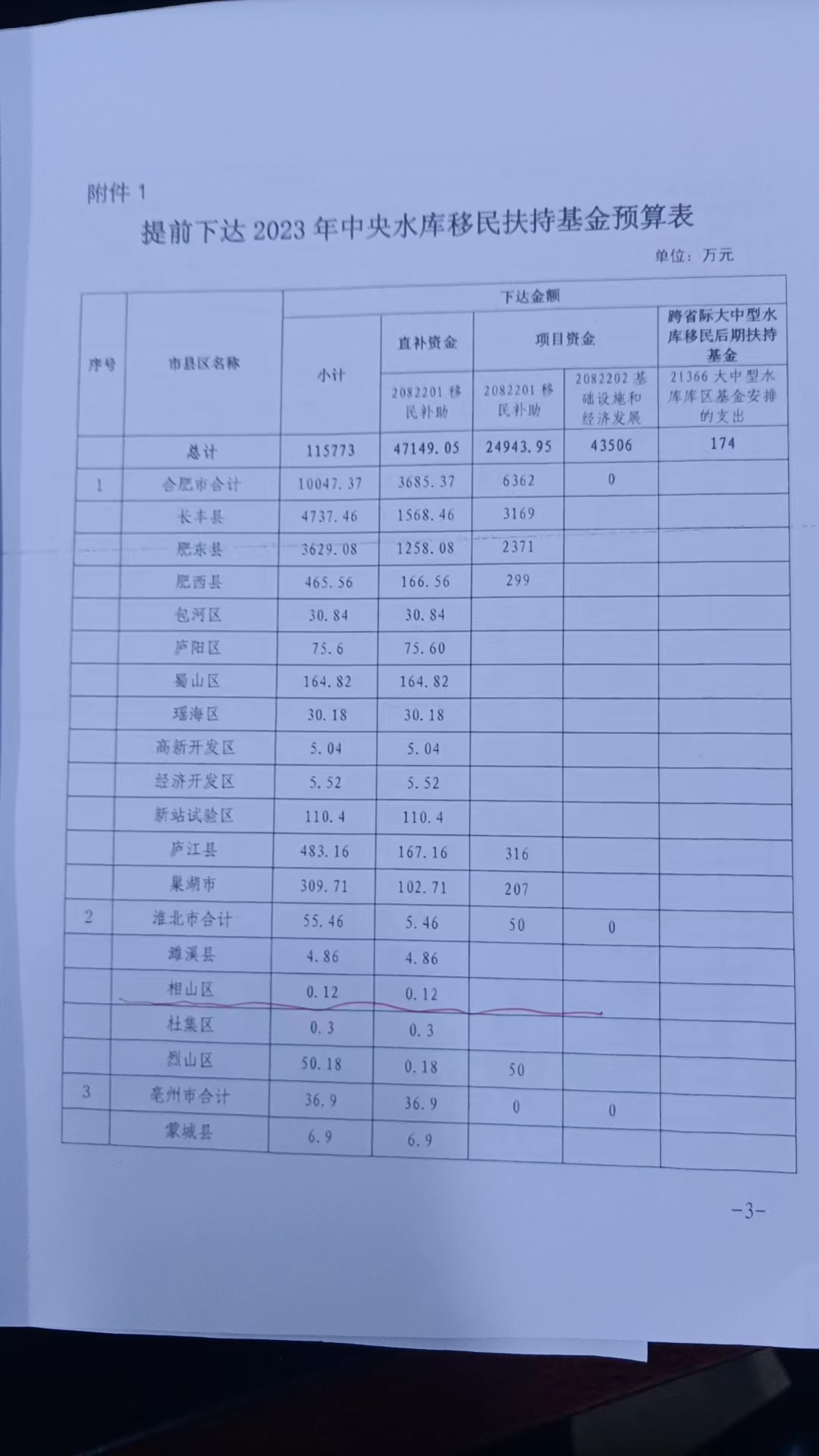 相山区2023年大中型水库移民后期扶持资金分配结果