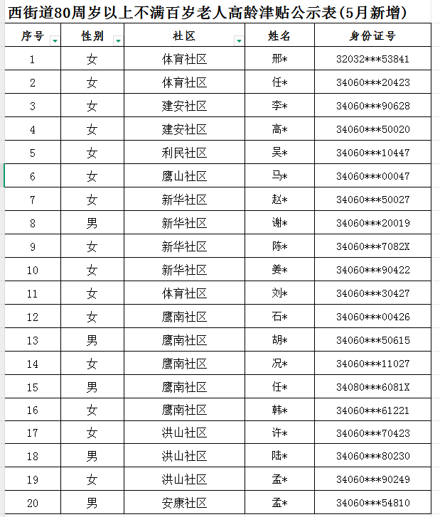 2025年西街道80周岁以上不满百岁老人高龄津贴公示表(5月新增)