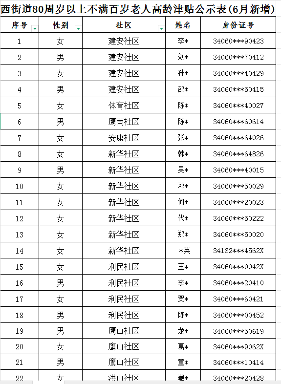 2025年西街道80周岁以上不满百岁老人高龄津贴公示表(6月新增)