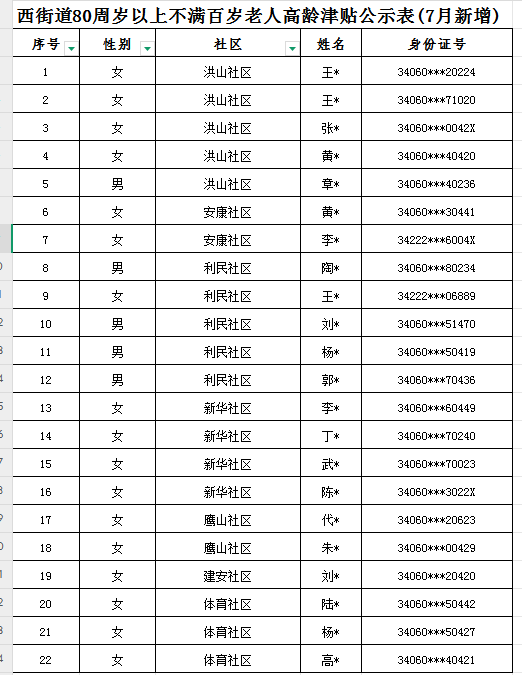 2025年西街道80周岁以上不满百岁老人高龄津贴公示表(7月新增)